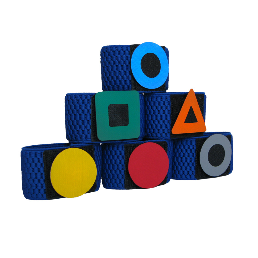 Kolorowe Opaski (28 sztuk) są wykorzystywane do ćwiczeń, w których pracuje większa grupa dzieci i każdy z uczestników ma przydzieloną jedną z figur geometrycznych.