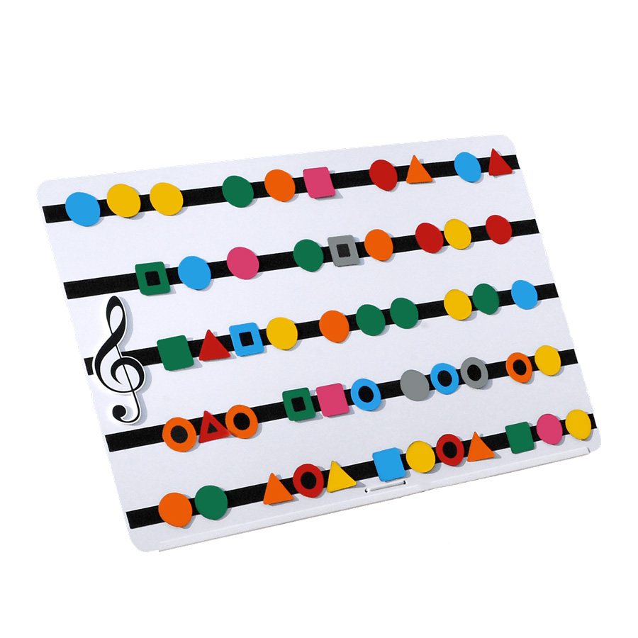 W zestawie z Tablicą Muzyczną znajduje się komplet rzepowych figur geometrycznych niezbędnych do pracy z dziećmi.